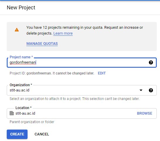 • Name it whatever and press Create (I'm using edu mail here so the organization is present. If you're using normal gmail, just set the organization to No organization)