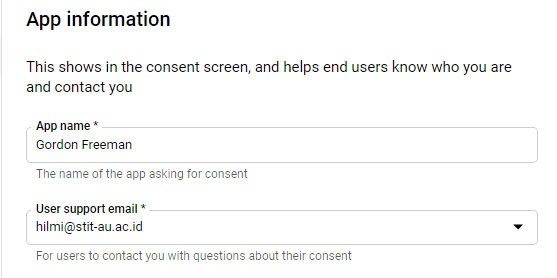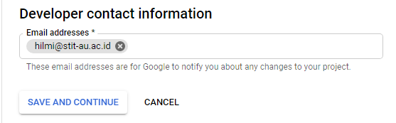 • Fill User support email and developer contact information with your google account, and ignore other configs. Press Save and Continue.