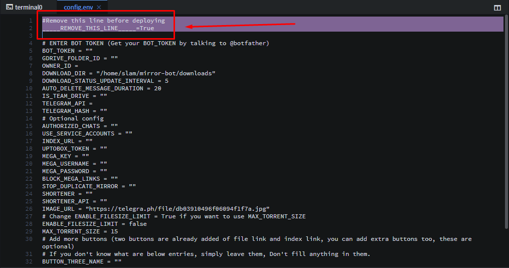 11) Now let's edit the config of the bot. (I'm using config.env for configurations here. The only downside is that you need to redeploy/update the app every time you change the config, if you prefer herok config vars, then just skip this and add manually all the vars in your herok app's config vars)