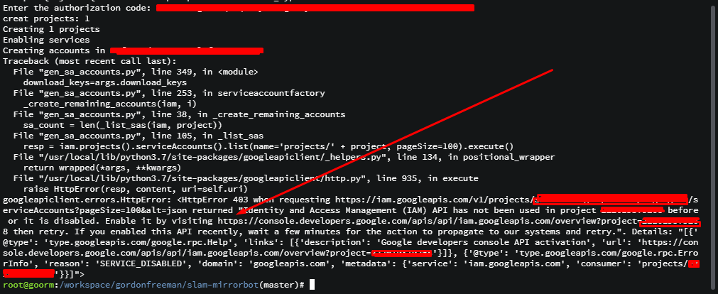 2) Make sure you still have credentials.json in the repo, it's needed for generating service accounts. After that, run these commands (one by one).